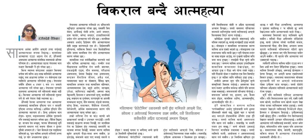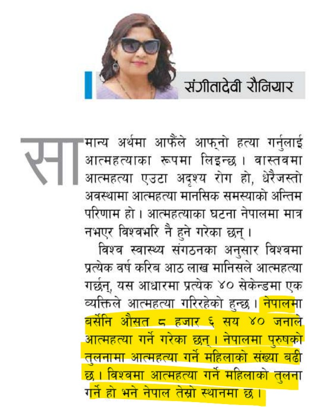 २०८२ जेठ १३ गते कान्तिपुरमा “विकराल बन्दै आत्महत्या” शीर्षकमा प्रकाशित संगीतादेवी रौनियारको लेखमा आत्महत्या सम्बन्धी केही तथ्याङ्क प्रस्तुत गरिएको छ।