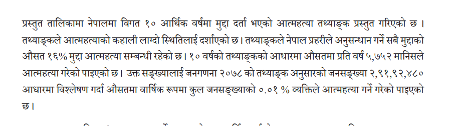 अतः आत्महत्याको तथ्याङ्क आधिकारिक रुपमा राख्ने नेपाल प्रहरीका अनुसार विगत १० वर्षको तथ्याङ्कका आधारमा औसत निकाल्दा नेपालमा प्रति वर्ष ५ हजार ७५२ जनाले आत्महत्या गरेको पाइएको छ, लेखमा दावी गरिए जस्तो ८ हजार ६४० जना होइन।