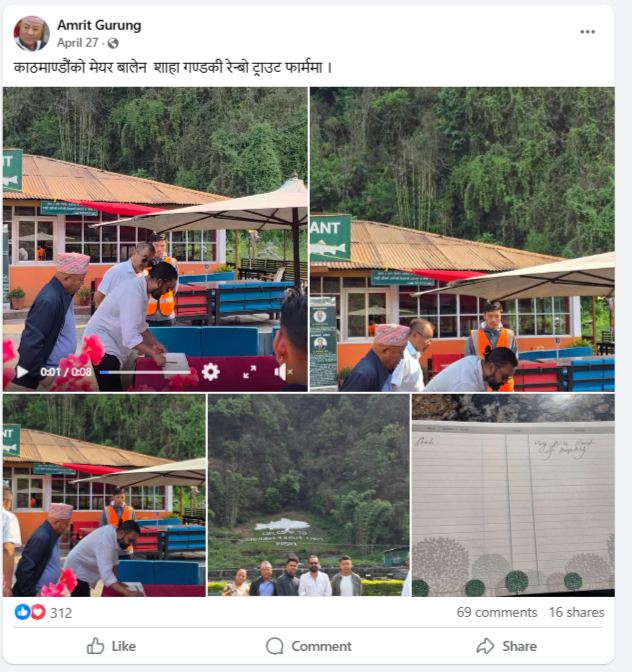 ट्राउट फार्मका सञ्चालक अमृत गुरुङ्गको फेसबुक प्रोफाइल हेर्दा गत बैशाख १४ गते केही फोटो सहित एक पोस्ट राखिएको भेटियो। काठमाण्डौंको मेयर बालेन शाहा गण्डकी रेन्बो ट्राउट फार्ममा भन्ने क्याप्सन राख्दै फोटो र भिडियो राखिएको हो। सो पोस्टमा मेयर शाहले हस्ताक्षर गर्दै गरेको जस्तो देखिने भिडियो पनि राखिएको छ। शाहले खाना र आतिथ्यता मन परेको उल्लेख गर्दै डायरीमा लेखेको जनाउँदै गुरुङ्गले अन्तिममा डायरीको फोटो पनि पोस्ट गरेका छन्।