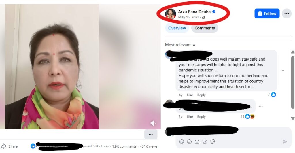 तथ्य जाँचको लागि हामीले उक्त भिडियोको स्क्रिनसट निकालेर गुगलमा रिभर्स इमेज सर्च गर्‍यौँ। सामाग्री हेर्दै जाँदा हामीले “Arzu  Rana Deuba” नामक पूर्व परराष्ट्र मन्त्रीको अफिसियल फेसबुक पेजमा राखेको भिडियो फेला पार्‍यौँ।