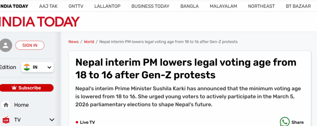 गत सेप्टेम्बर २५ (असोज ९ गते) मा इण्डिया टुडेमा छापिएको समाचारको हेडलाइनमै मतदान गर्न पाउने उमेर नेपालमा १८ बाट १६ वर्ष पुऱ्याइएको दावी छ।