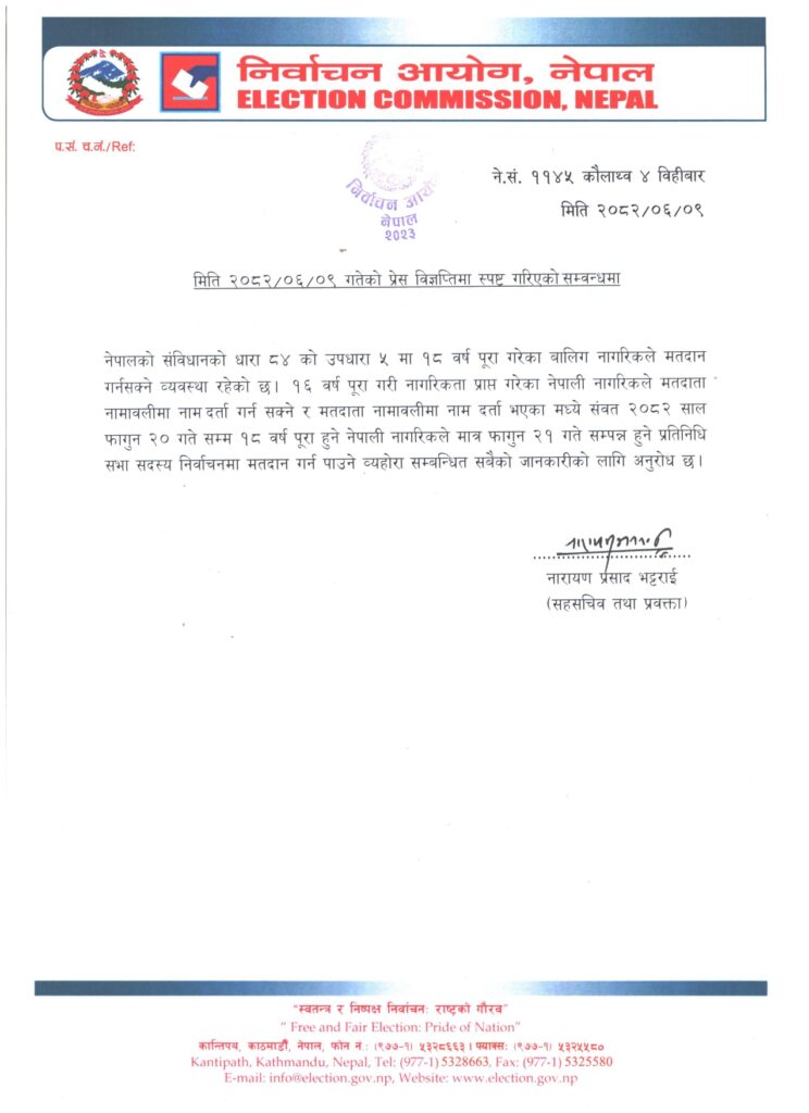 यस सम्बन्धमा निर्वाचन आयोगले समेत प्रेस विज्ञप्ति गत असोज ९ गते जारी गरेको छ। आयोगको प्रेस विज्ञप्ति अनुसार १६ वर्ष पूरा गरेर नेपाली नागरिकता प्राप्त गरेका व्यक्तिले मतदाता नामावलीमा नाम दर्ता भने गराउन सक्नेछन्। तर मतदान गर्नका लागि भने २०८२ फागुन २० गतेसम्म १८ वर्ष पूरा गरेको हुनुपर्ने विज्ञप्तिमा स्पष्ट उल्लेख छ।