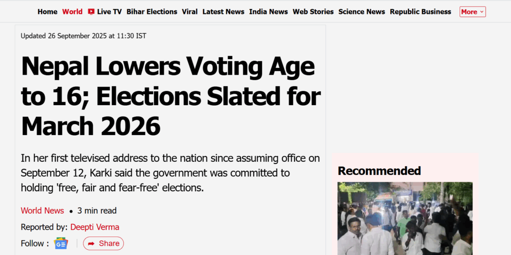 नेपालमा मतदान गर्न सकिने उमेर १८ बाट घटाएर १६ वर्ष पुऱ्याइएको दावी गर्दै केही भारतीय सञ्चारमाध्यमले समाचार प्रकाशन गरेका छन्। अन्तरिम सरकारकी प्रधानमन्त्री सुशीला कार्कीको सरकारले यस्तो निर्णय गरेको दावी गर्दै ती समाचारमा जेन-जी आन्दोलनपछिको परिस्थितिमा मतदान गर्न पाउने उमेर घटाइएको उल्लेख छ।