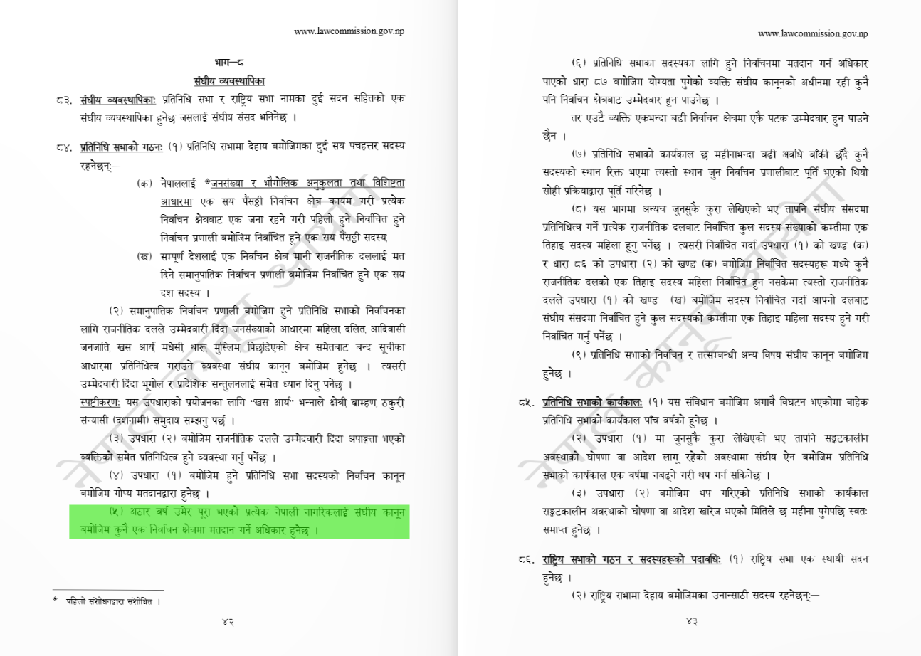 नेपालको संवैधानिक व्यवस्था अनुसार १८ वर्ष पूरा गरेको नेपाली नागरिकले मात्रै प्रतिनिधि सभा निर्वाचनमा मतदान गर्न पाउने व्यवस्था छ। नेपालको संविधानको धारा ८४ को उपधारा ५ मा यो व्यवस्था गरिएको छ।