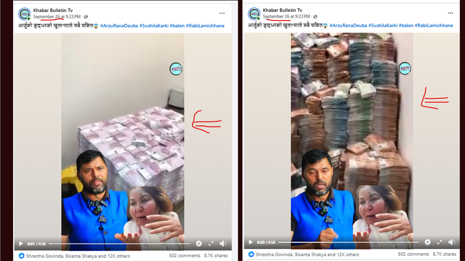 भिडियोमा नोटको थुप्रो देखिन्छ। केही नोट जलेको अवस्थामा पनि देख्न सकिन्छ। यो तथ्यजाँच गर्दासम्म यो भिडियो ८ हजार ७ सयले सेयर गरेका छन् भने १२ हजार लाइक र ५ सयभन्दा बढीले कमेन्ट गरेका छन् । भिडिओ हेर्नेहरुले भिडिओमा देखिएको नोटको थुप्रोलाई शेरबहादुर देउवाको घरमा भेटिएको रुपमा बुझिरहेका छन्।