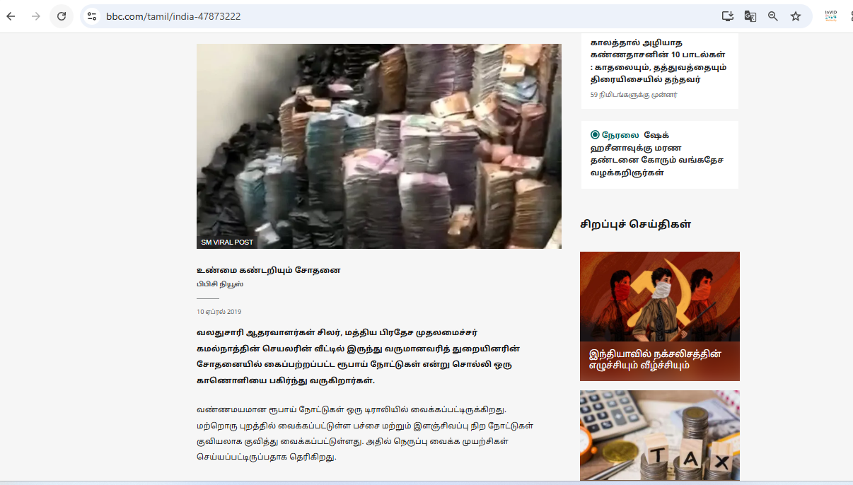 यस क्रममा बीबीसी तमिलले सन् २०१९ को अप्रिल १० मा यसबारे तथ्यजाँच गरेको भेटियो। सन् २०१९ मा भारत मध्यप्रदेशका मुख्यमन्त्री कमलनाथका निजी सचिवको घरमा आयकर विभागले छापा मार्दा जफत गरेको नोटको थुप्रो भन्दै यही भिडयो भाइरल बनाइएको थियो ।
