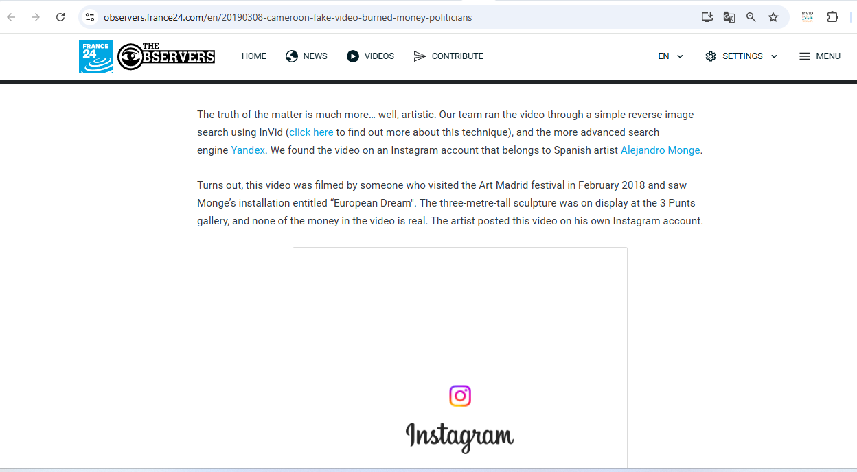 तथ्यजाँचका क्रममा द अब्जर्भरले पनि भिडिओमा देखिएको कुनै पनि पैसा वास्तविक नभएको, कलाकार अलेजान्ड्रो मोंगेले बनाएको एक कलात्मक दृश्य मात्रै भएको पुष्टि भयो ।