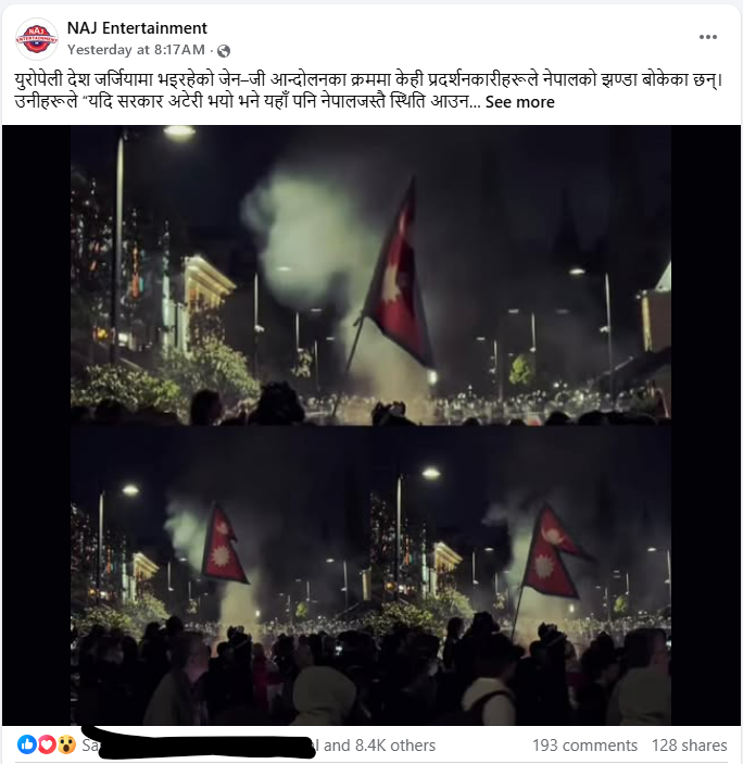 ११ लाख फलोअर्स भएको फेसबुक पेज एनएजे इन्टरटेनमेन्टले सोमबार (अक्टोबर ६, २०२५) बिहान युरोपेली देश जर्जियामा भइरहेको जेन–जी आन्दोलनका क्रममा केही प्रदर्शनकारीहरूले नेपालको झण्डा बोकेका छन् लेख्दै फोटोसहितको पोस्ट गरेको छ। हेर्नुस् अर्काइभ लिङ्क। हेर्नुस् स्क्रिनसट-