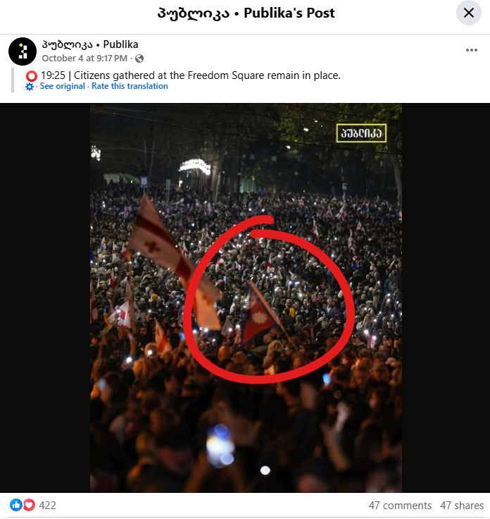 आन्दोलन र नेपाली झण्डा देखिएको दृश्य सत्य भए नभएको पत्ता लगाउन हाम्रो सोसल मिडियामार्फत् आग्रह आएकोले हामीले यसबारे तथ्य जाँच गरेका छौँ। हामीले जर्जियाको तथ्य जाँच संस्था र पत्रकारहरुसँग सम्पर्क गर्दा नेपाली झण्डा देखिएको दृश्य सही भए पनि आन्दोलन जेन-जीको मात्र नभई सबै उमेर समूहका व्यक्ति सहभागी भएको पुष्टि गर्‍यौँ।