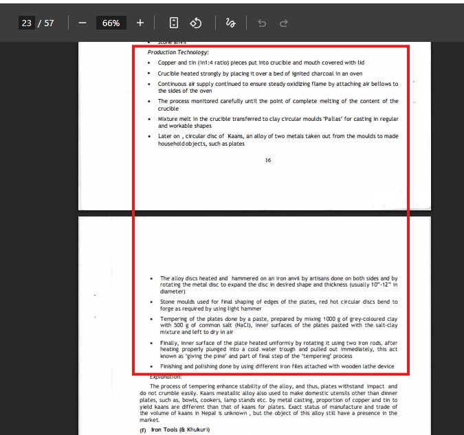 यो रिपोर्टको १६ नम्बर पेजमा चरेस (कांस) अर्थात अंग्रेजीमा BRONZE का भाँडाहरु बनाउने विधिबारे उल्लेख गरिएको छ । कांसको भाँडा बनाउनका लागि कपर (CU) र टिन (SN) आवश्यक पर्ने उल्लेख गरिएको छ । तर कच्चा पदार्थमा सीसा (लिड) को आवश्यकताबारे कतै पनि उल्लेख गरिएको छैन।
