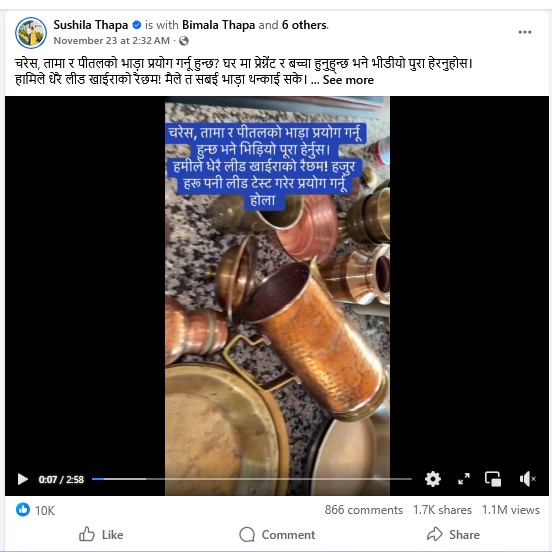 त्यसैगरी सुशीला थापा नामको फेसबुक एकाउन्टबाट पनि नोभेम्बर २३ मा चरेस, तामा र पित्तलको भाँडा प्रयोग गर्नुहुन्छ भने सावधान रहनुहोला भन्दै २ मिनेट ५८ सेकेन्डको भिडियो सार्वजनिक भएको छ। यसमा उनले लिड टेस्ट किटले आफ्नो घरमा भएका चरेस (कांस), तामा र पित्तलको भाँडामा सीसा (लिड) को मात्रा छ कि छैन भनेर जाँच गर्दा सीसाको मात्रा भेटिएको दावी गरिएको छ।