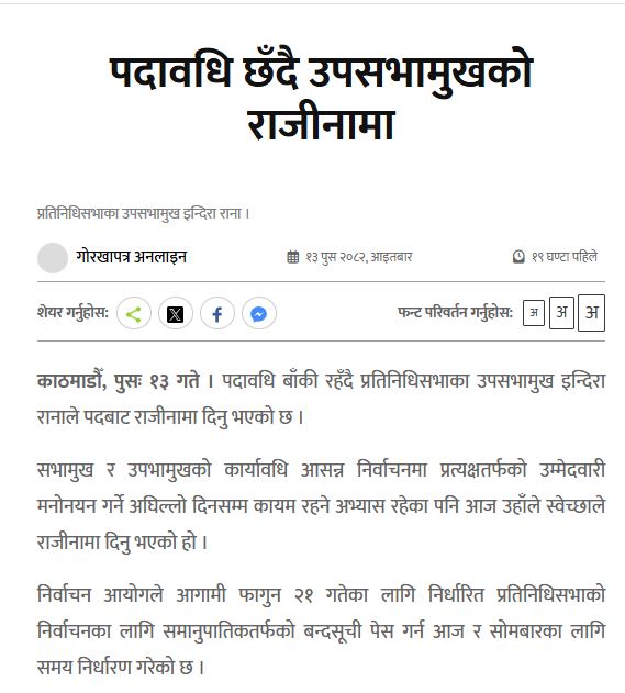 गोरखापत्र अनलाइनमा पुस १३ गते ‘पदावधि छँदै उपसभामुखको राजीनामा’ शीर्षकमा समाचार प्रकाशित भएको छ।
