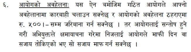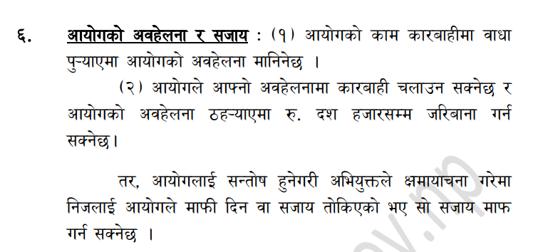 हामीले कानून मन्त्रालयको वेबसाइटमा उपलब्ध २०७५ बैशाख १९ गते सम्म संशोधित जाँचबुझ आयोग ऐन, २०२६ पढ्यौं। जाँचबुझ आयोग ऐन २०२६ को दफा ६ मा आयोगको अवहेलना सम्बन्धी व्यवस्था रहेको छ। सो अवहेलनाको कारवाहीमा ५०० रुपैयाँ सम्मको जरिवानाको व्यवस्था रहेको पाइयो।