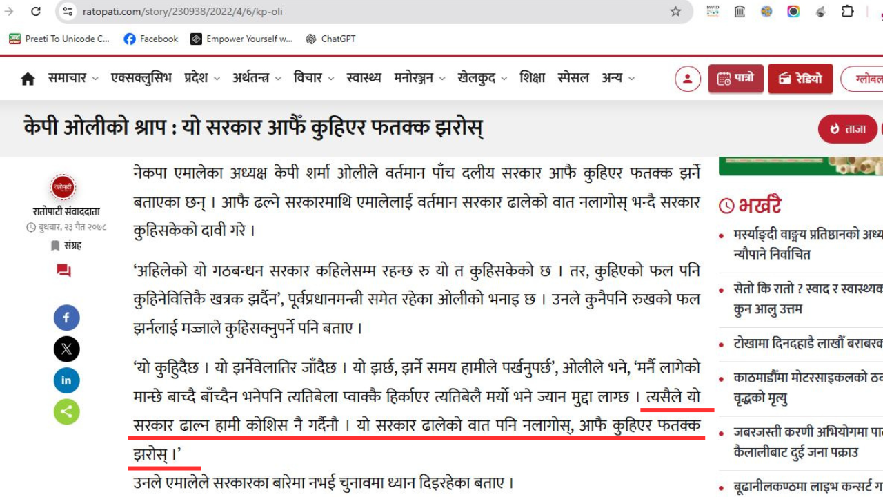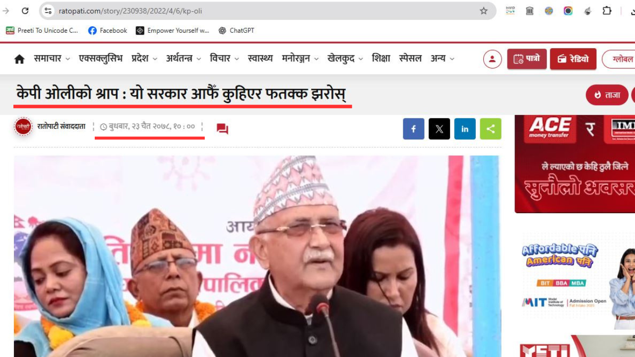 हामीले पूर्व प्रधानमन्त्री समेत रहेका एमाले अध्यक्ष ओलीले भाषणमा भनेका केही शब्दहरूलाई गुगलमा ‘की वर्ड’ सर्च गर्यौ । सोही क्रममा हामीले २०७८ चैत २३ गते बुधबार रातोपाटी डटकममा “केपी ओलीको श्राप : यो सरकार आफैँ कुहिएर फतक्क झरोस्” शीर्षकमा प्रकाशित समाचार भेट्यौँ । उक्त समाचारमा ओलीको सोही प्रसङ्गलाई जोडिएको छ ।