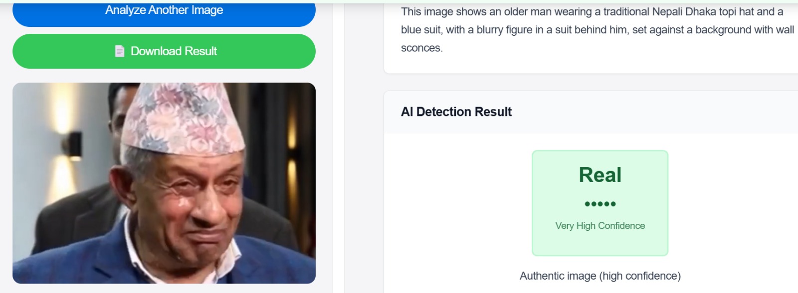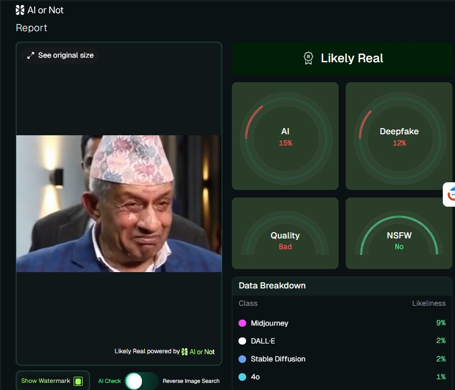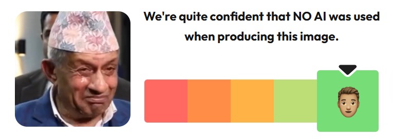 त्यसैगरी Hive AI image+deepfake classifier को निष्कर्ष पनि एआईबाट बनाइएको होइन भन्ने नै रह्यो।