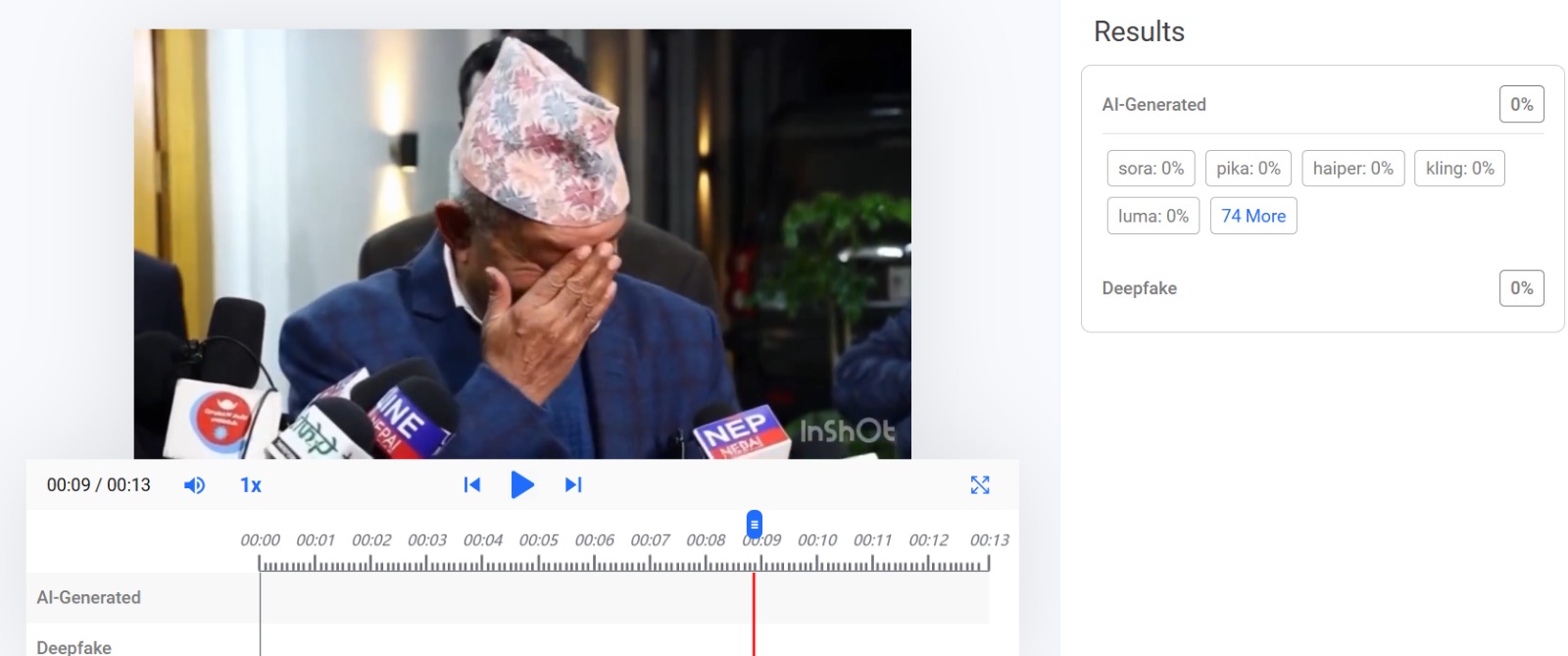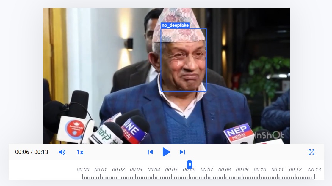 हामीले भाइरल भिडियोमा एआईको प्रयोग गरिएको हो वा होइन भन्ने बुझ्नको लागि डिपफेक एनलाइसेस युनिट (DAU) लाई सम्पर्क गर्‍यौँ।  उक्त युनिटले भाइरल भिडियोमा एआइको प्रयोगबारे विभिन्न टुल्सको प्रयोग गरी जाँच गर्‍यो। तर, अधिकांश टुल्सले भिडियो एआई प्रयोग गरी नबनाइएको देखायो।