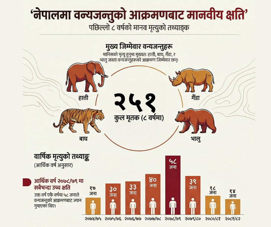 राष्ट्रिय निकुञ्ज तथा वन्यजन्तु संरक्षण विभागका अनुसार पछिल्लो आठ वर्षमा मात्रै वन्यजन्तुको आक्रमणबाट २५१ जनाले ज्यान गुमाएका छन्। आर्थिक वर्ष २०८१/८२ मा १४ जनाको मृत्यु भयो भने हजारौँ क्षतिको घटना दर्ता भए। अघिल्लो वर्ष २०८०/८१ मा मात्रै १८ जनाको मृत्यु भयो। यस अवधिमा सयौँ मानिस घाइते भए र सयौँ घरगोठमा क्षति पुग्यो। उता, संरक्षित क्षेत्रमै सयौँ वन्यजन्तुको मृत्यु भएको तथ्यांक पनि छ।