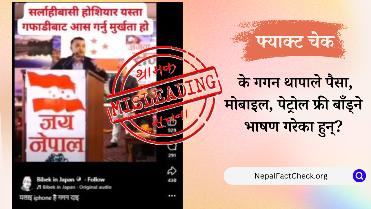 तर, हाम्रो तथ्यजाँचले यो भिडियो भ्रामक भएको पुष्टि गरेको छ। उक्त भिडियो गगन थापाको भाषण काँटछाँट गरी गलत अर्थ लाग्ने गरी प्रस्तुत गरिएको हो।