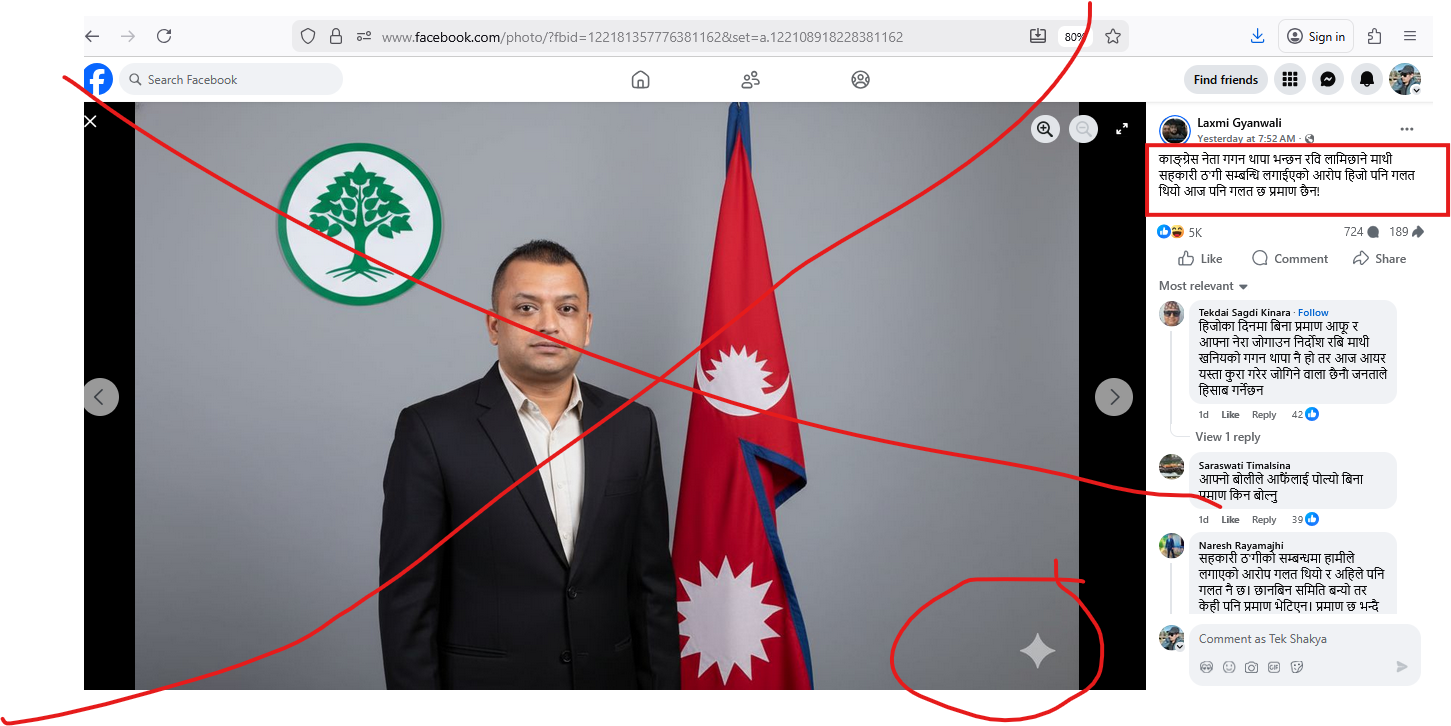 पोस्टमा नेपाली का‌ंग्रेसका महामन्त्री गगन थापाले सहकारी ठगी सम्बन्धी प्रकरणमा रवि लामिछानेमाथि लगाइएको आरोप हिजो पनि गलत थियो र आज पनि गलत छ, प्रमाण छैन भनेर बोलेको दाबी गरिएको छ। लेखिएको छ, “कांग्रेस नेता गगन थापा भन्छन् रवि लामिछाने माथि सहकारी ठगी सम्बन्धि लगाइएको आरोप हिजो पनि गलत थियो, आज पनि गलत छ, प्रमाण छैन !”