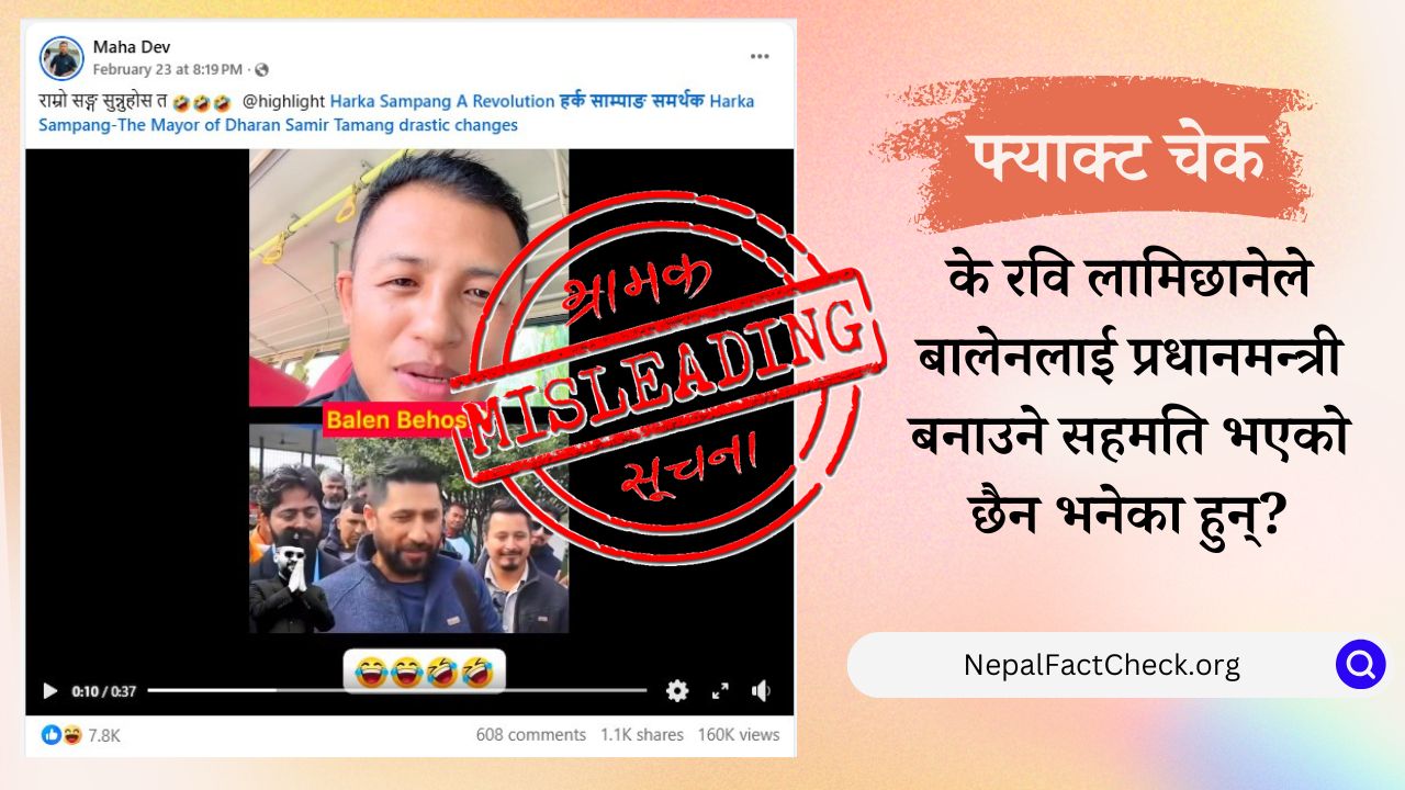 राष्ट्रिय स्वतन्त्र पार्टीका (रास्वपा) सभापति रवि लामिछानेले वरिष्ठ नेता बालेन शाहलाई प्रधानमन्त्रीको उम्मेदवार बनाउने गरी सहमति नभएको दावी गर्दै राष्ट्रिय श्रम संस्कृति पार्टीको चुनाव चिन्ह माटोमा भोट हाल्न आह्वान गरिएको एउटा भिडियो फेसबुकमा फैलिएको छ। तर, हाम्रो तथ्यजाँचमा यो दावी भ्रामक देखियो। यो भिडियो बालेन रास्वपा प्रवेश गर्नुअघिको भिडियोलाई सन्दर्भ फरक पारेर अपलोड गरिएको हो।
