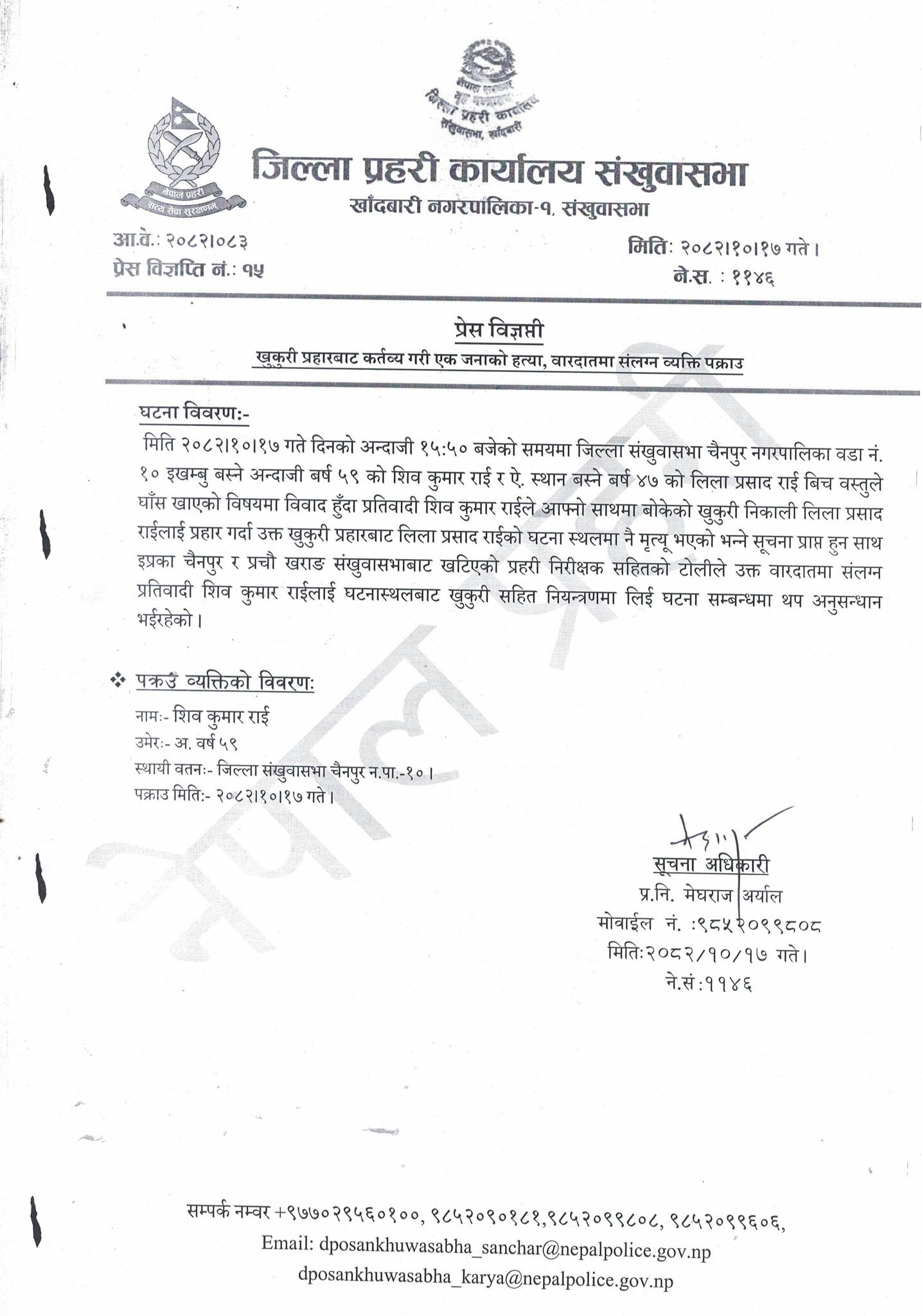 हेर्नुहोस्, जिल्ला प्रहरी कार्यालय सङखुवासभाले जारी माघ १७ गते जारी गरेको प्रेस विज्ञप्ती :