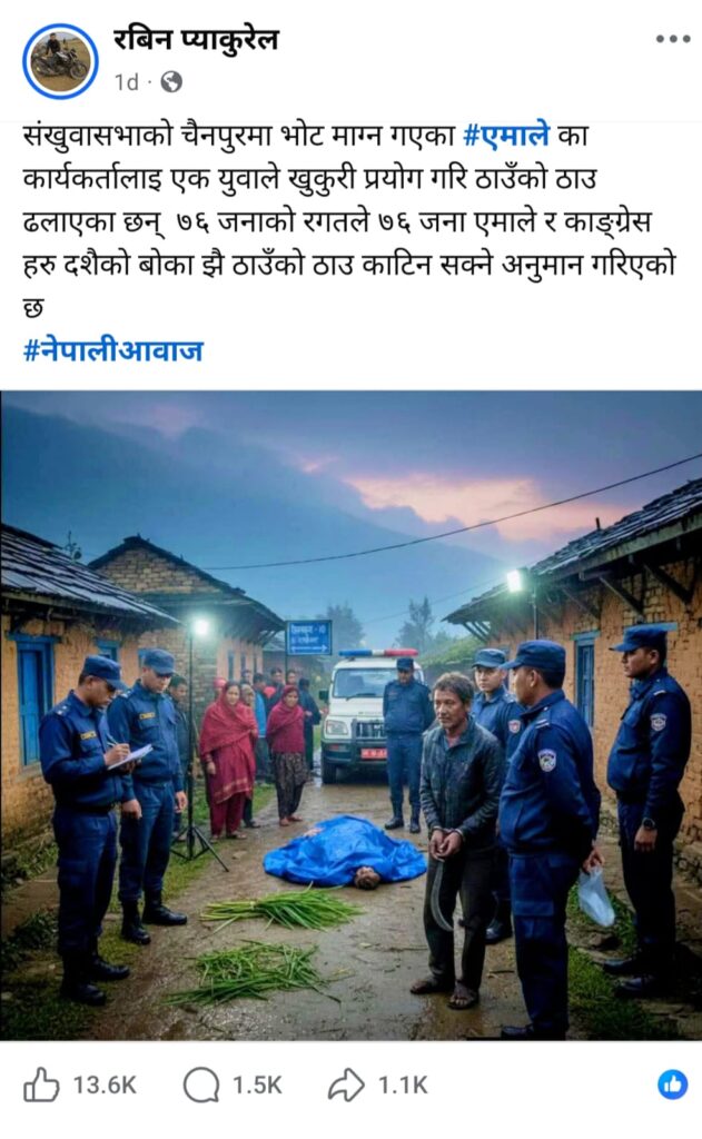 रबिन प्याकुरेल नामक फेसबुक एकाउन्टमा पनि सोही दिन नै सङ्खुवासभाको चैनपुरमा भोट माग्न गएका एमालेका कार्यकर्तालाई एक युवाले खुकुरी प्रयोग गरेको भन्ने दाबीसहित पोस्ट गरिएको गरिएको छ । हामीले तथ्य जाँच गर्दै गर्दा उक्त पोस्टमा १३ हजार ६ सयले रियाक्सन, १५ सयले कमेन्ट गरेका छन् भने १ हजार १ सय पटक सेयर गरिएको छ ।