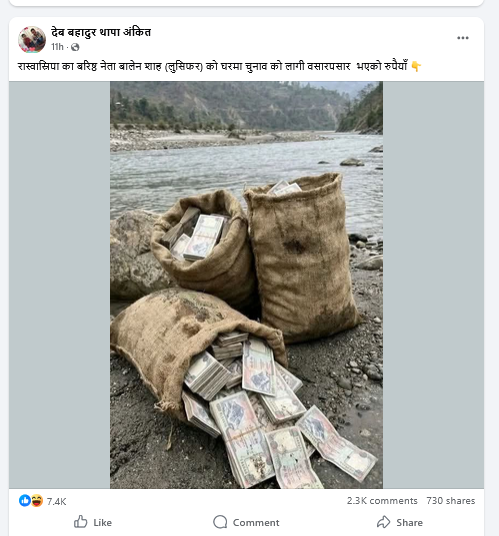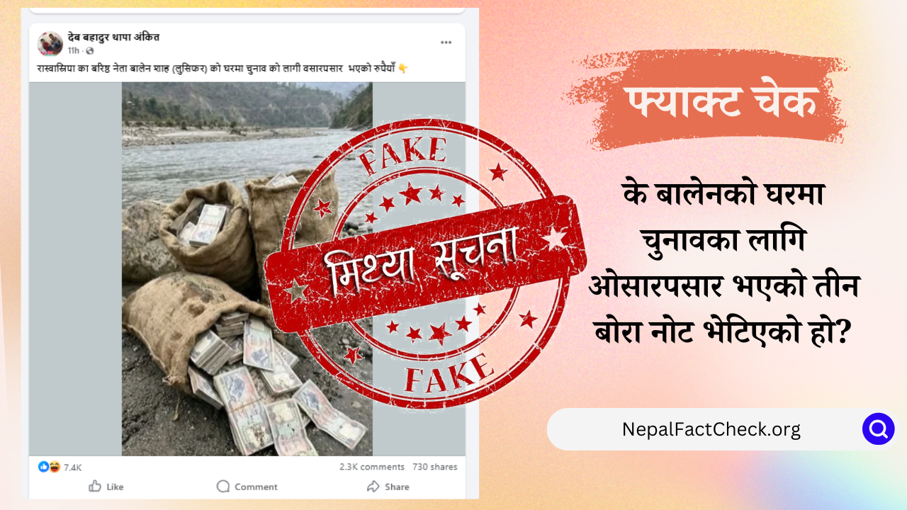राष्ट्रिय स्वतन्त्र पार्टी (रास्वपा)का वरिष्ठ नेता एवम् झापा निर्वाचन क्षेत्र नम्बर ५ का लागि प्रतिनिधिसभा सदस्य उम्मेदवार बालेन शाहको घरमा चुनावको लागि ओसारपसार भएको रुपैयाँ भेटिएको दावी गर्दै नदी किनारमा तीन बोरा नेपाली हजारका नोट जस्तो देखिने एउटा फोटो सामाजिक सञ्जालमा भाइरल छ। तर हाम्रो तथ्य जाँचले यो दाबी मिथ्या रहेको र फोटो पनि एआईबाट तयार पारिएको पुष्टि भएको छ।