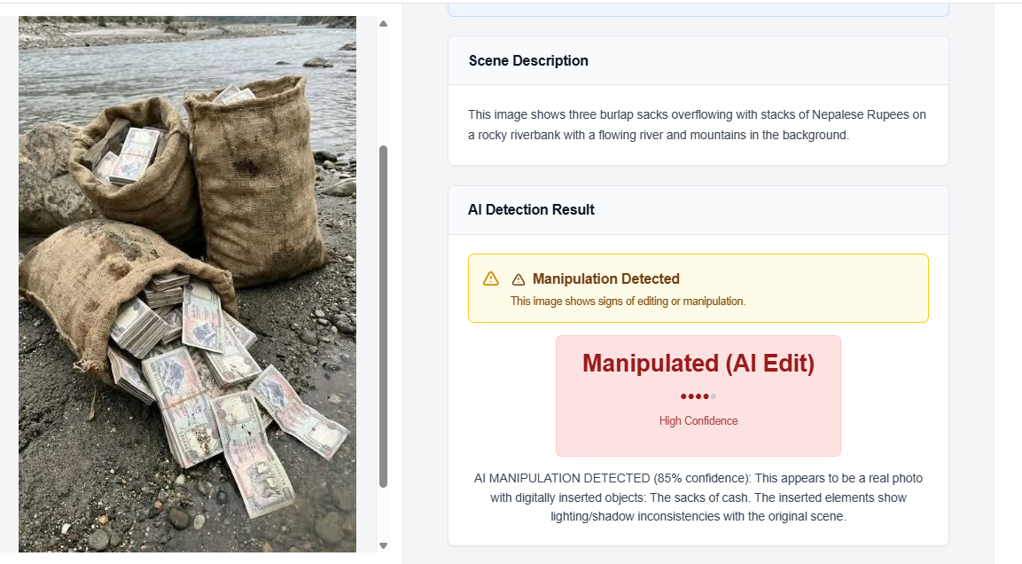 त्यसपछि हामीले उक्त तस्वीरलाई इमेजह्विस्पररमा जाँच गर्यौँ। इमेज ह्विस्पररले पनि यो तस्वीर एआई निर्मित गरेर सम्पादन भएको पुष्टि गर्यो । यो टुलले एआई मार्फत हेरफेर गरेको ८५ प्रतिशत सम्भावना देखायो भने यो फोटो वास्तविक जस्तै देखिएपनि नोट, बोरा र मूल्यको दृश्यबीच प्रकाश र छायाँमा बेमेल देखिएको दाबी गर्यो।