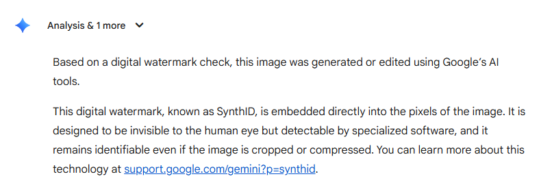 त्यसपछि हामीले यो फोटोलाई गुगलबाट Synth ID परीक्षण गरेर हेर्यौँ। गुगलको Synth ID Check भनेको गुगलले विकास गरेको SynthID प्रविधि हो, जसले एआईले बनाएको फोटो, अडियो, भिडियो वा टेक्स्टमा अदृश्य डिजिटल वाटरमार्क राख्छ र त्यसको माध्यमबाट सामग्री एआई जेनेरेटेड हो कि होइन भनेर पहिचान गर्न मद्दत गर्छ।