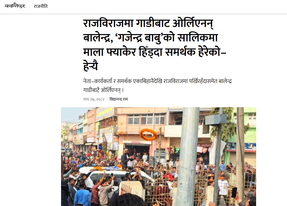 इकान्तिपुर डटकमले मंगलवार (२०८२ साल माघ २७ गते) ‘राजविराजमा गाडीबाट ओर्लिएनन् बालेन्द्र, ‘गजेन्द्र बाबु’को सालिकमा माला फ्याकेर हिँड्दा समर्थक हेरेको–हेर्‍यै’ शीर्षकमा समाचार प्रकाशित गरेको छ। समाचारमा राखिएको फोटोमा बालेन गाडीमा देखिएका छन् भने उनका समर्थकहरु पनि देखिन्छ।