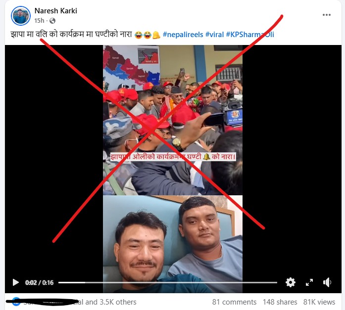 नरेश कार्की नामका फेसबुक प्रयोगकर्ताले ‘झापामा ओलीको कार्यक्रममा घण्टीको नारा’ लेख्दै बुधबार (२०२६ फेब्रुअरी ४) बेलुकी एउटा भिडियो अपलोड गरेका छन्। भिडियोमा दुई फ्रेममा एउटामा केपी ओली र कार्यकर्ताहरु देखिन्छन् भने अर्कोमा दुई जना व्यक्ति हाँसिरहेका देखिन्छन्।