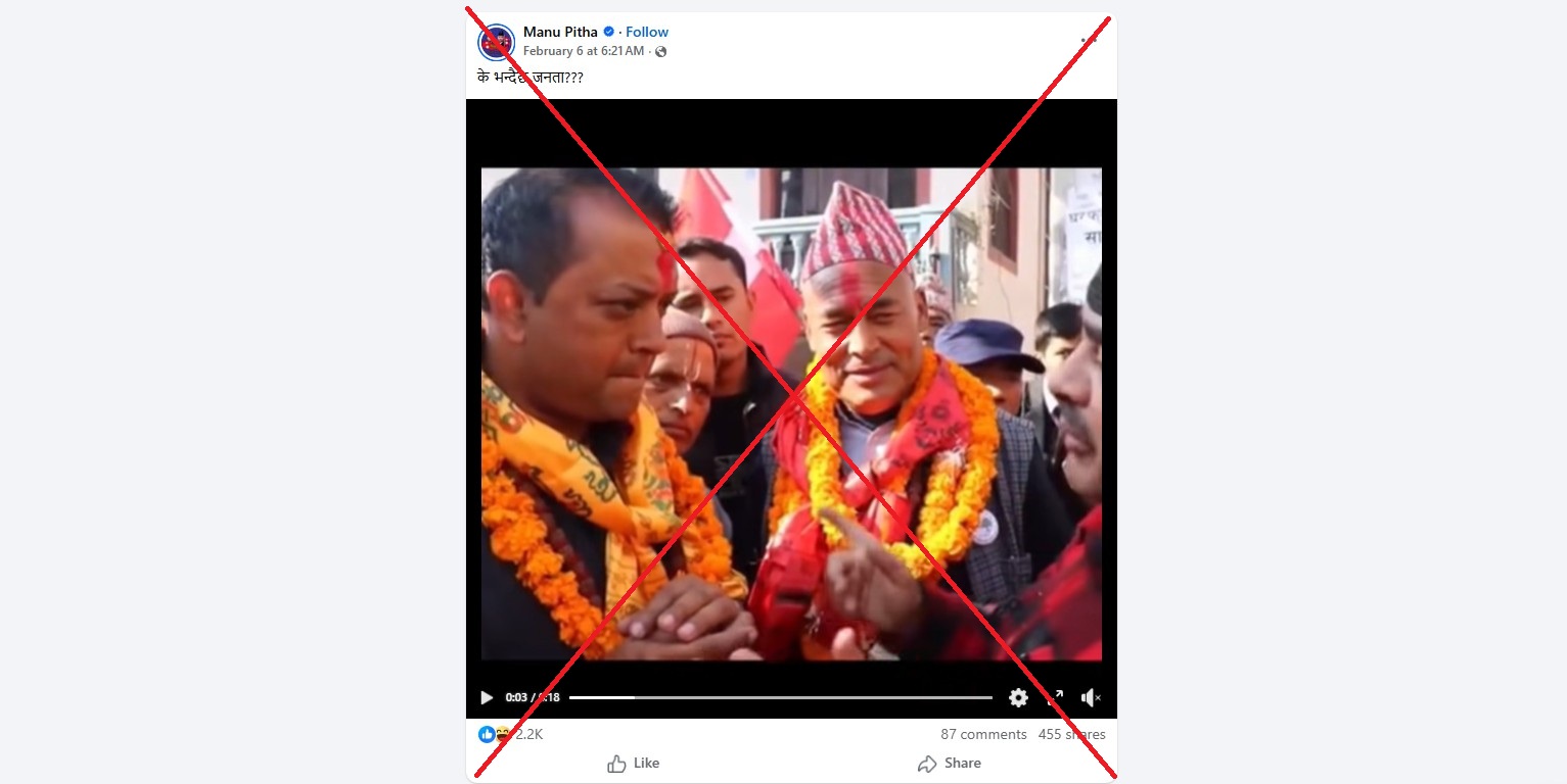 फेब्रुअरी ७ दिउँसो १ः१४ मा रामजी यादव नामक फेसबुक प्रयोगकर्ताले गगन थापाले मत माग्दै गरेको उक्त भिडियो फेसबुकमा अपलोड गरेका छन् । ‘यो भन्दा ठुलो सम्मान कुन उम्मेदवारलाई हुन्छ होला त ?’ भन्ने शीर्षकसहित हालिएको १८ सेकेन्डको भिडियोमा हामीले तथ्य जाँच गर्दै गर्दा दुई हजार ९ सय बढी लाइक, एक सय ६५ कमेन्ट र दुई सय ६७ पटक शेयर गरिएको छ ।
