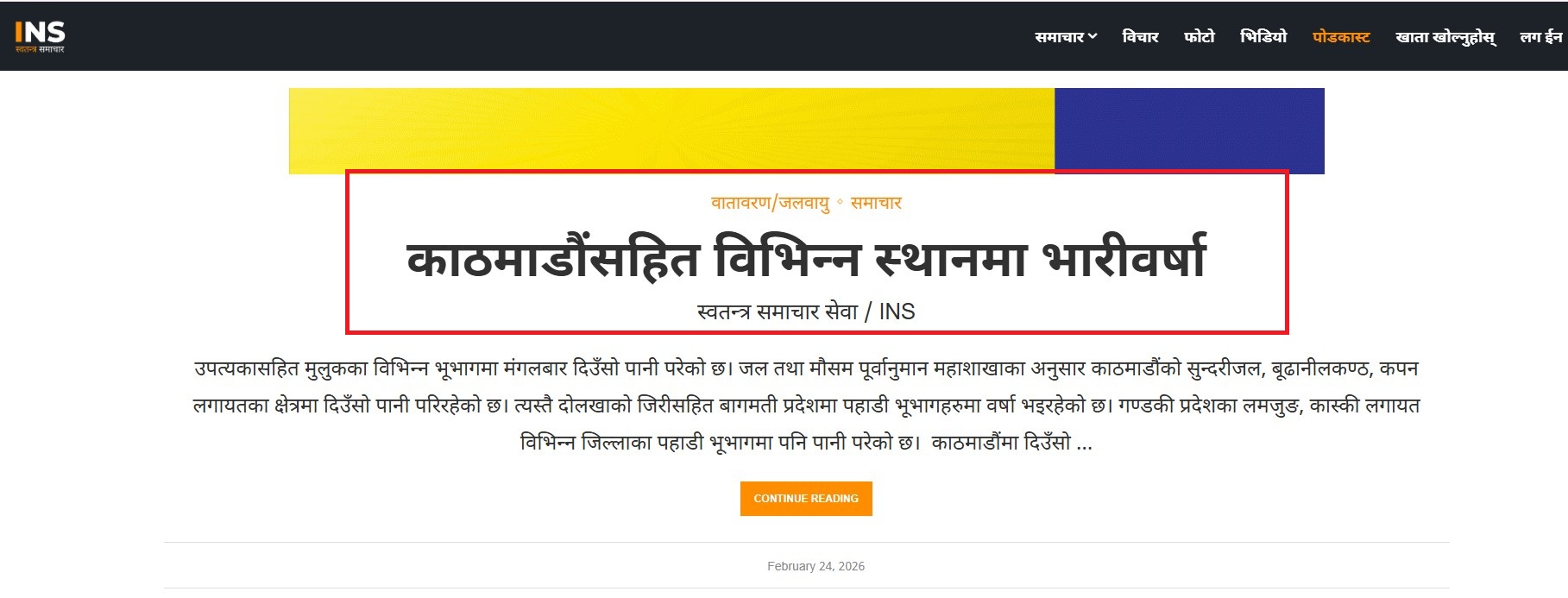आइएनएस डट न्युज (आइएनएस स्वतन्त्र समाचार)मा मंगलबार (फेब्रुअरी २४) मा ‘काठमाडौंसहित विभिन्न स्थानमा भारी वर्षा’ शीर्षकमा एउटा समाचार प्रकाशित भयो, जसमा उपत्यकासहित मुलुकका विभिन्न भूभागमा मंगलबार दिउँसो पानी परेको उल्लेख छ।