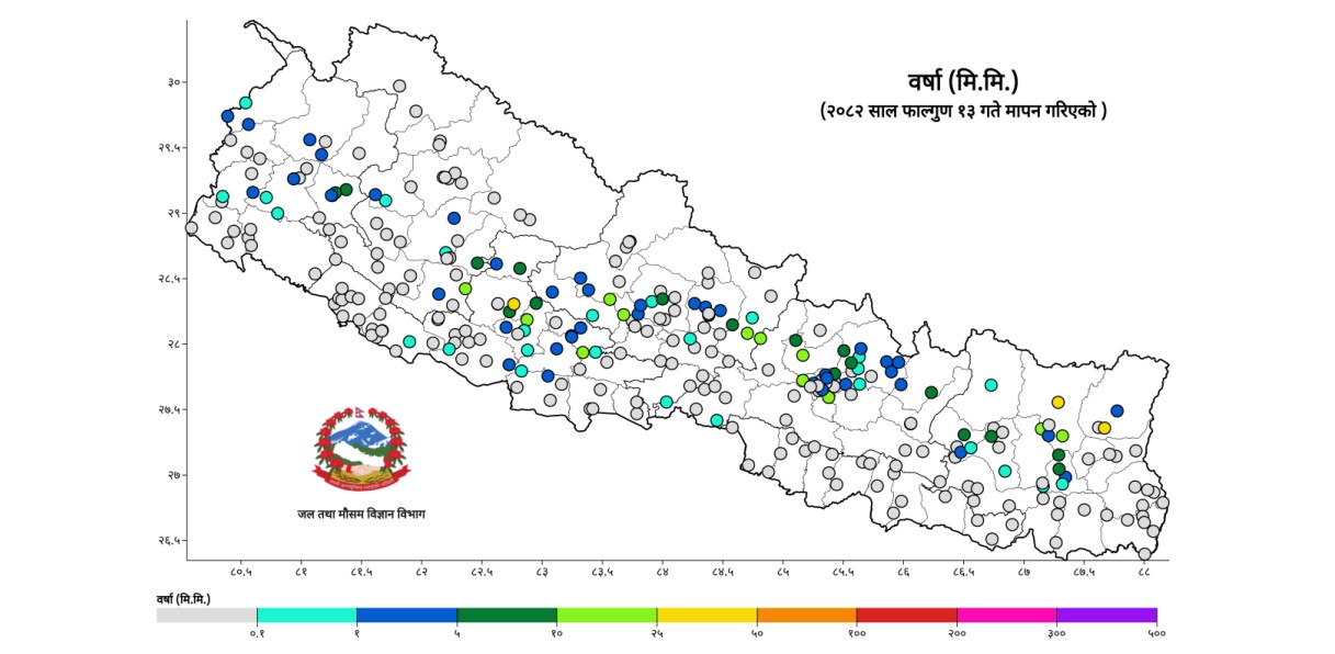 तथ्य जाँच गर्ने क्रममा हामीले जल तथा मौसम विज्ञान विभागअन्तर्गतको हावापानी विज्ञान महाशाखा/हावापानी विश्लेषण शाखासँग सम्पर्क गर्यौ । उक्त महाशाखाले दैनिक रूपमा अवलोकन गरेको मौसम गतिविधिअनुसार फागुन १२ गते बिहान ०८:४५ बजेदेखि फागुन १३ बिहान ०८:४५ बजे सम्म देशभरका ७७ वटा केन्द्रहरूमा वर्षा भएको छ।