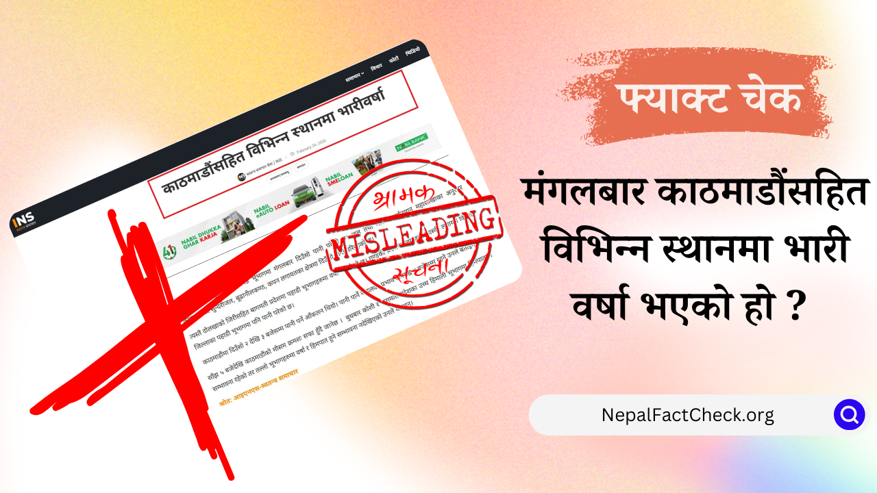 आइएनएस डट न्युज (आइएनएस स्वतन्त्र समाचार)मा मंगलबार ‘काठमाडौंसहित विभिन्न स्थानमा भारी वर्षा’ शीर्षकमा एउटा समाचार प्रकाशित भयो। तर, हाम्रो तथ्य जाँचले मंगलबार काठमाडौंसहित देशका विभिन्न स्थानमा वर्षा भएको सही भए पनि ‘भारी वर्षा’को परिभाषामा पर्ने गरी वर्षा भने नभएको देखियो।