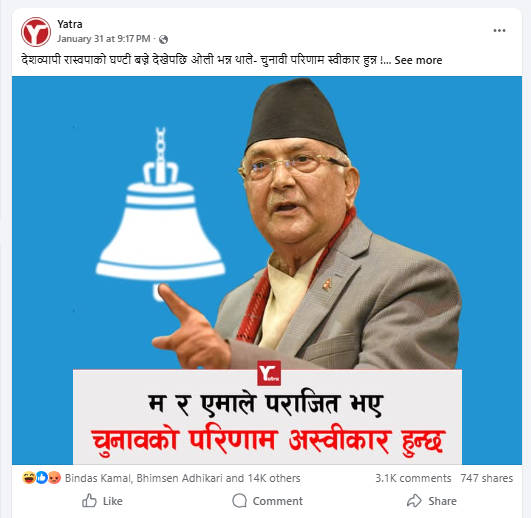 ३५ हजार फलोअर्स रहेको यात्रा नामक फेसबुक पेजले पनि जनवरी ३१ को दिन नै यही दाबीसहित केपी शर्मा ओलीको फोटोसहित एउटा स्टायटस राखेको छ । यो तथ्य जाँच गर्ने समयसम्ममा यो पोस्टले १४ हजार रियाक्सन पाएको छ भने ३ हजार १ सय कमेन्ट र ७४७ जनाले सेयर गरेका छन् । कमेन्ट गर्ने अधिकांशले केपी शर्मा ओलीको चर्को आलोचना गरिरहेका छन् ।