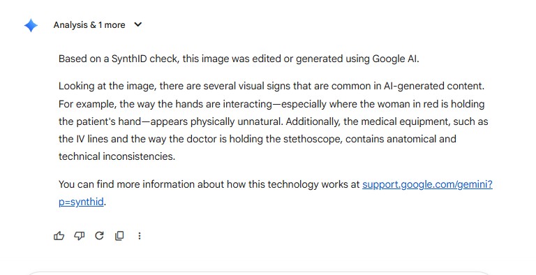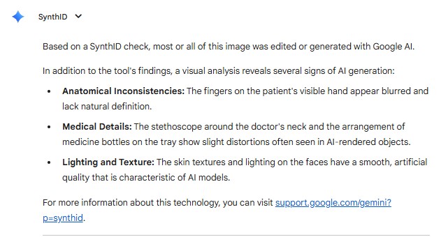 डाक्टरले स्टेथोस्कोप समातेको तरिका र आईभी (IV) ड्रिपका पाइपहरू शरीरमा जोडिएको अवस्था चिकित्सा विज्ञानको हिसाबले अस्वाभाविक देखिन्छ। तस्विरमा रहेका व्यक्तिहरूको भाव र प्रकाशको सन्तुलनमा पनि केही कृत्रिमता महसुस गर्न सकिने गुगलको synthID नतिजाले देखायो ।