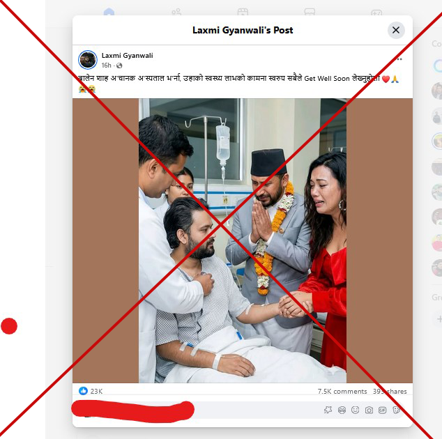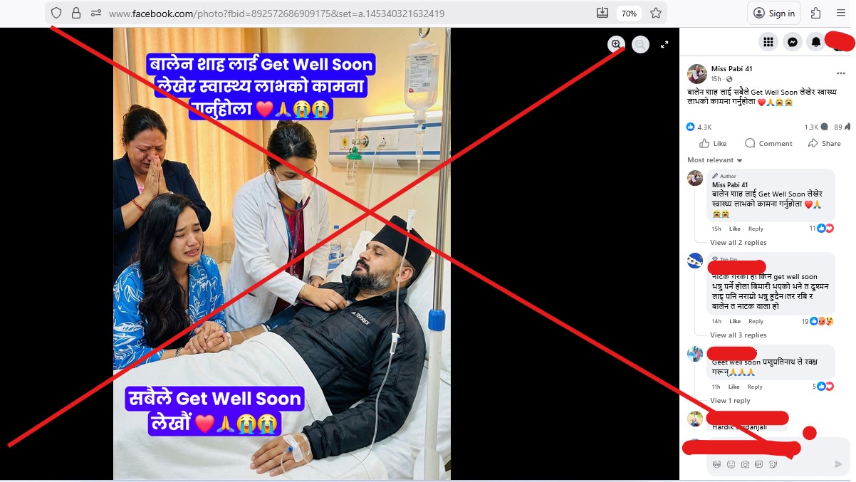 रास्वपाका वरीष्ठ नेता एवम् प्रतिनिधसभा सदस्यका लागि झापा-५ का रास्वपा उम्मेदवार बालेन्द्र शाह बिरामी भएर अस्पताल भर्ना भएको, बालेनलाई भेट्न रवि लामिछानेलगायत व्यक्ति अस्पतालमै पुगेको लगायत दाबीसहितको तस्बिर सामाजिक सञ्जालमा भाईरल देखिन्छन् ।