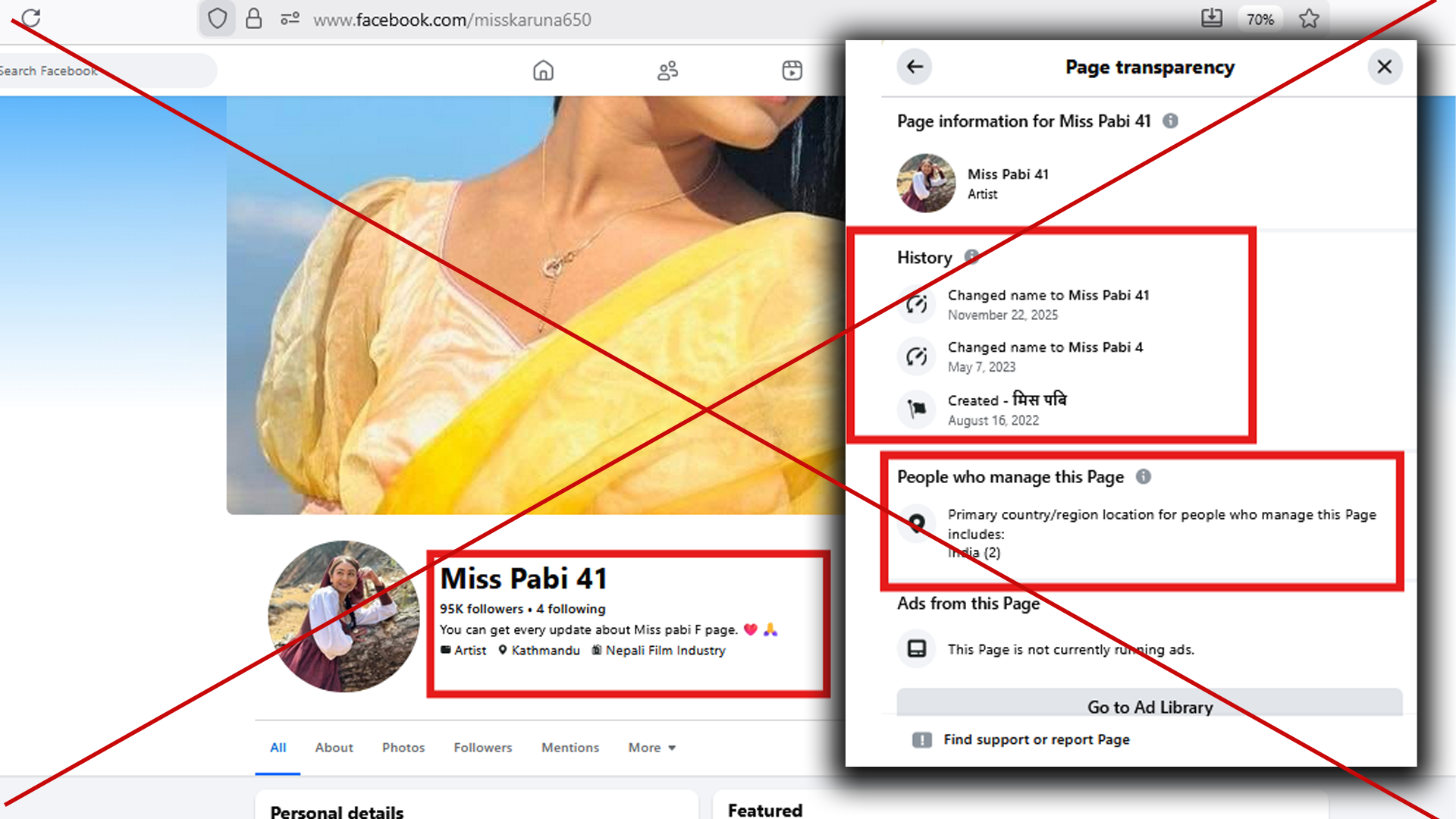 यो फेसबुक पेजको ट्रान्सपरेन्सी चेक गर्दा २०२२ को अगस्ट २६ मा पेज क्रेट भएको देखिन्छ । प्रोफाईलमा कलाकार मिस पबिको तस्बिर राखिएको छ । पेजको नाम २ पटक नाम परिवर्तन गरिएको देखिन्छ । पेजको २ वटा एडमिन भारतको लोकेशनमा देखिन्छ । नेपालको लोकेशनमा कुनै पनि एडमिन देखिँदैन । यो पेज नै भ्रामक एवम् मिथ्या सूचना फैल्याउन खोलिएको देखिन्छ ।