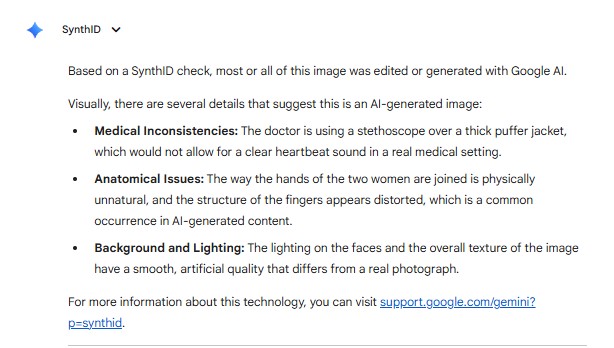 यो तस्बिर एआई निर्मित हो कि होईन भनेर हामीले गुगलको synthID मार्फत जाँच गरेर हेर्यौँ । synthID ले यो तस्बिर गुगल एआईमार्फत परिमार्जन एवम् निर्माण गरिएको दाबी गर्यो । रातो लुगा लगाएकी महिलाले बिरामीको हात समातेको तरिका प्राकृतिक देखिँदैन । एआईले प्रायः हात र औंलाहरूको सूक्ष्म विवरण मिलाउन संघर्ष गर्छ।