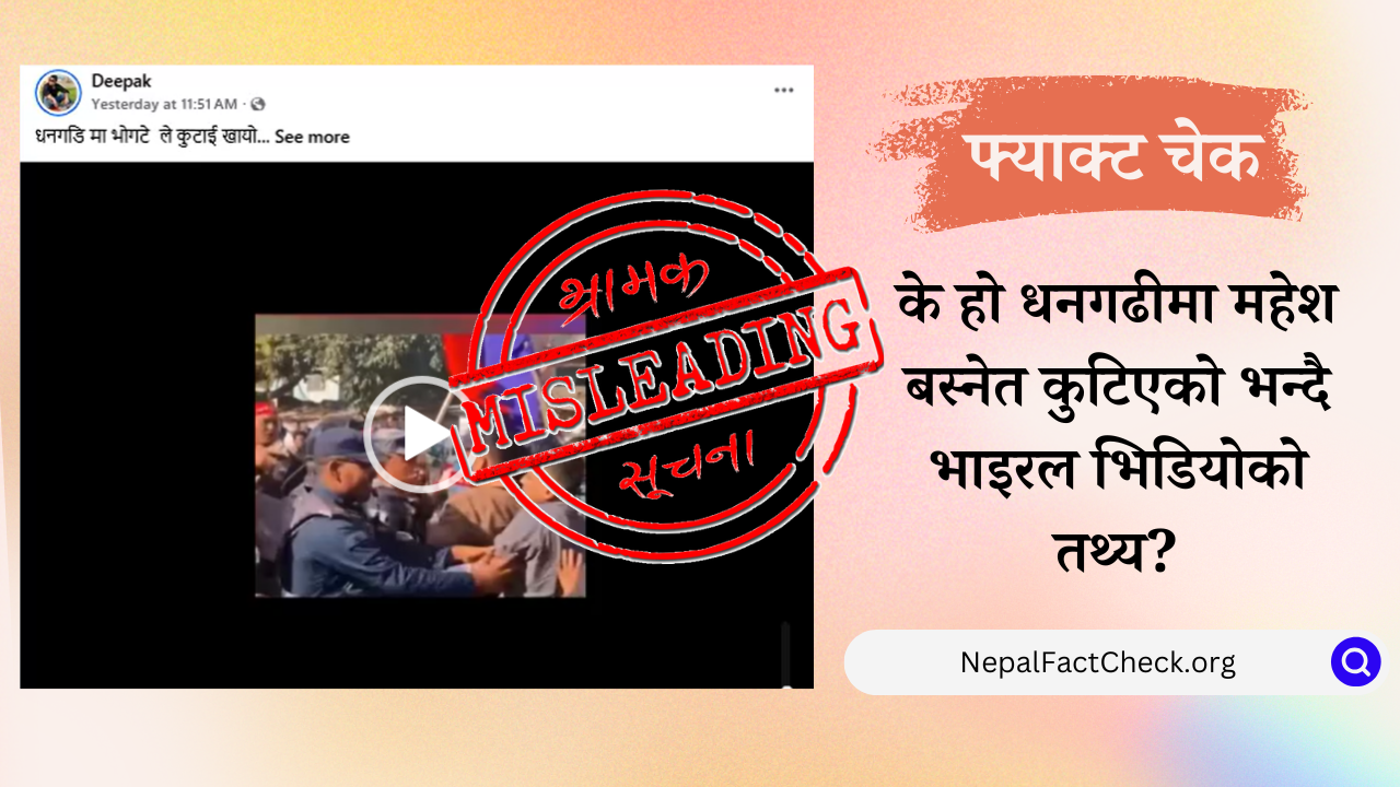 फागुन २१ गतेका लागि तय भएको प्रतिनिधिसभा सदस्य चुनावका लागि भक्तपुर निर्वाचन क्षेत्र नम्बर २ का एमाले उम्मेदवार एवम् एमाले सचिव महेश बस्नेतले धनगढीमा कुटाइ खाएको दावीसहितको भिडियो सामाजिक सञ्जालमा भाइरल बनिरहेको छ। तर हाम्रो तथ्य जाँचले भाइरल भिडियो दुई महिनाअघिको पुरानो रहेको भेटियो भने दावी गरिए जस्तो बस्नेत न भिडियोमा कतै देखिएका छन् न कुटाइ खाएको पुष्टि हुने कुनै आधार नै छ।