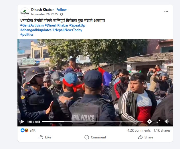 यो भिडिओको तथ्य जाँच गर्नका लागि भिडिओबाट एउटा फ्रेम निकालेर गुगल रिभर्स इमेज सर्च गर्दा हामी दिनेश खबरको आधिकारिक फेसबुक पेजमा पुग्यौँ जहाँ सन् २०२५ को नोभेम्बर २६ मा धनगढीमा जेनजीले गरेको शान्तिपूर्ण विरोधमा युवा संघले आक्रमण गरेको दावीसहितको ४ मिनेट ४४ सेकेन्डको भिडियो पोष्ट भएको छ। दिनेश खबरको भिडियोको १ मिनेटपछिको दृश्यसँग अहिले भाइरल भइरहेको भिडियो मिलेको देखियो।