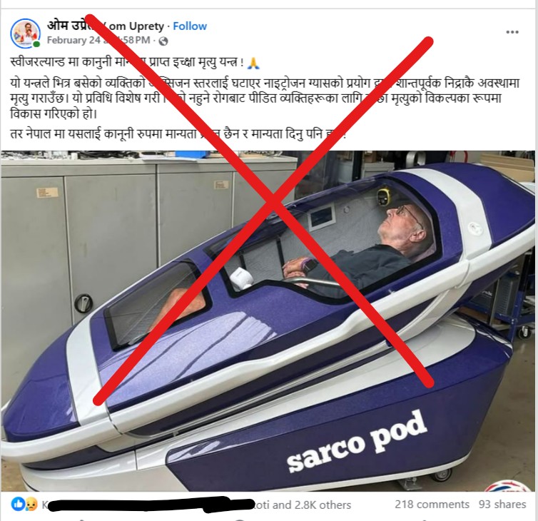स्विजरल्याण्डमा सार्को पोड नामको इच्छामृत्यु यन्त्रले कानुनी मान्यता प्राप्त गरेको दावीसहितको पोस्ट फेसबुकमा भाइरल भएको छ।