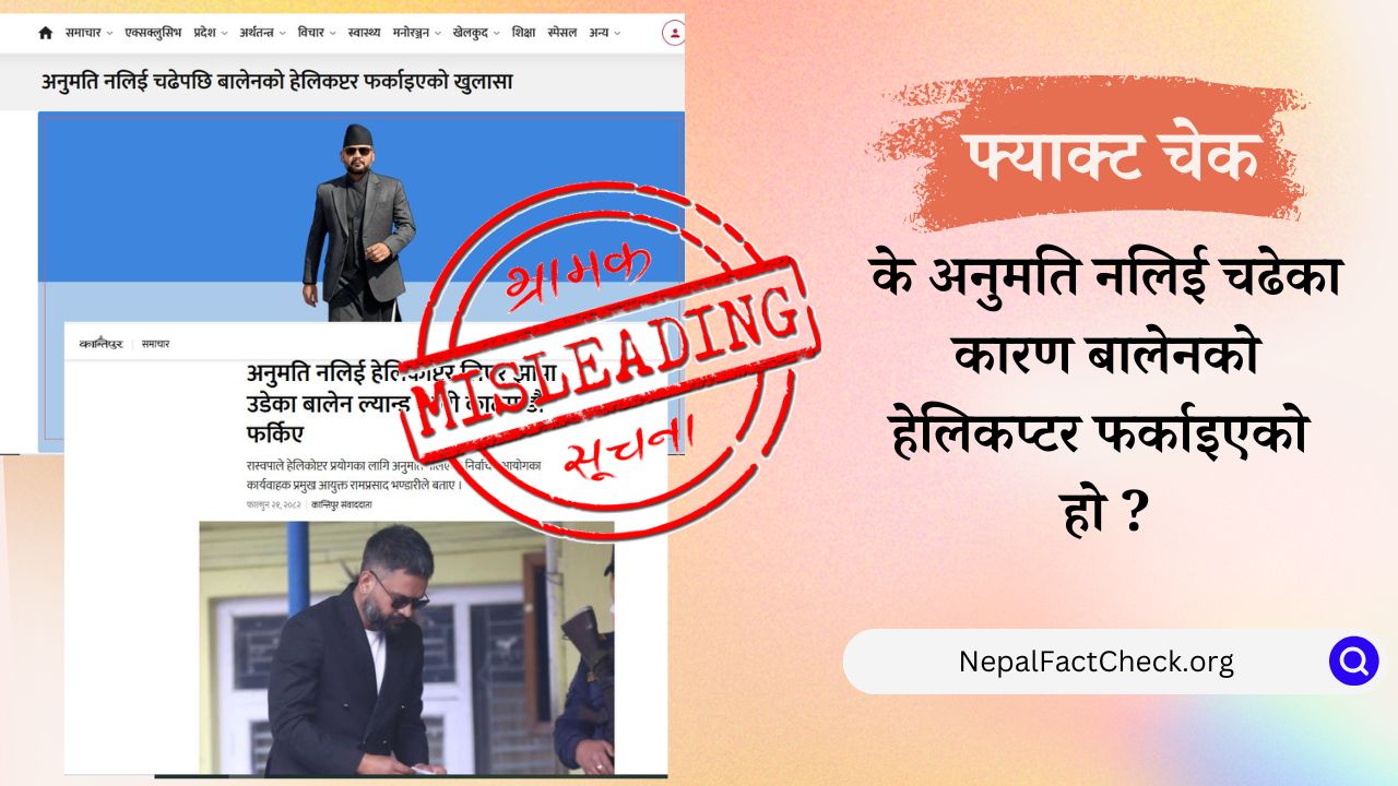 तर नेपालफ्याक्टचेकको तथ्यजाँचले उक्त दावी भ्रामक रहेको पुष्टि गरेको छ। बालेन शाह चढेको हेलिकप्टर अनुमति नलिएको कारण नभई सुरक्षाको कारण देखाउँदै अवतरण नगराई फर्काइएको हो।