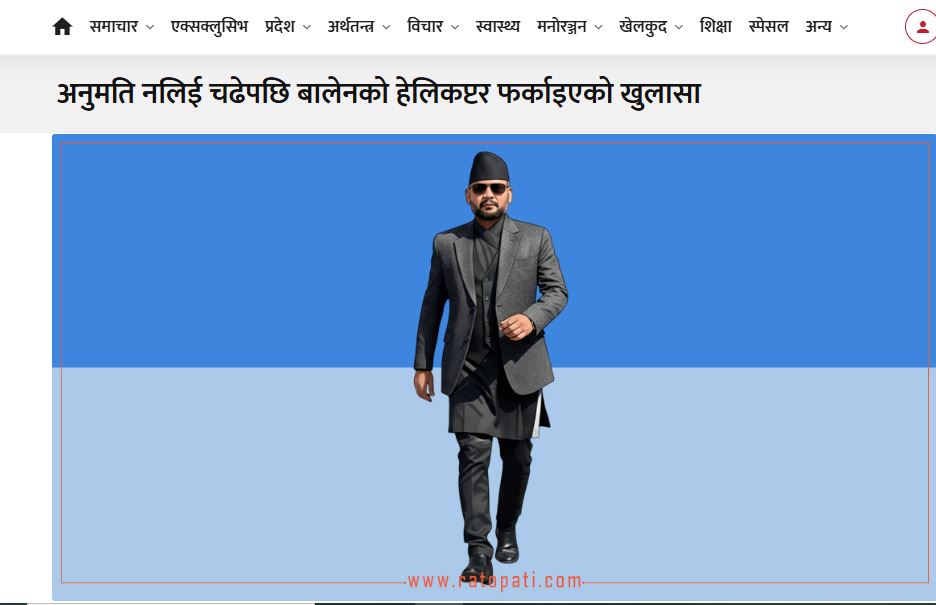 फागुन २१ गते रातोपाटी अनलाइनले ‘अनुमति नलिई चढेपछि बालेनको हेलिकप्टर फर्काइएको खुलासा’ शीर्षकमा समाचार प्रकाशित गरेको छ।
