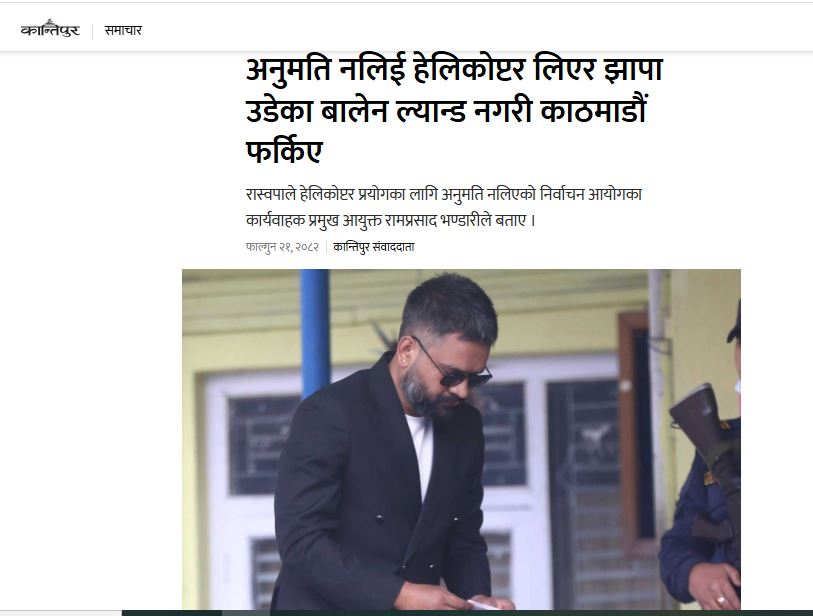त्यस्तै, ‘अनुमति नलिई हेलिकोप्टर लिएर झापा उडेका बालेन ल्यान्ड नगरी काठमाडौं फर्किए’ शीर्षकमा इकान्तिपुर डटकमले पनि समाचार राखेको छ।