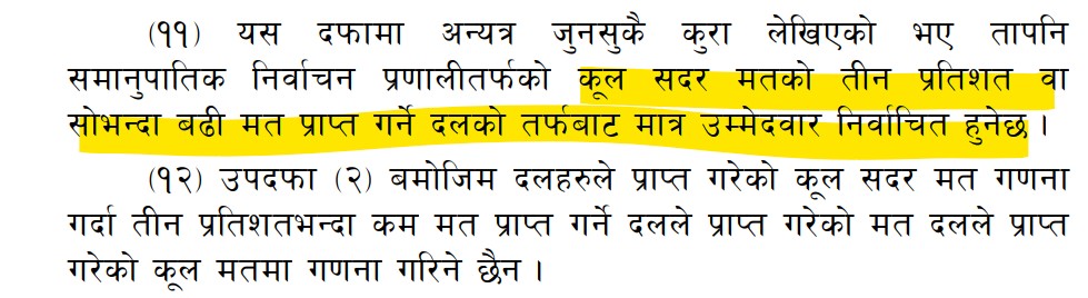 अर्थात् ऐनले समानुपातिक निर्वाचन प्रणालीतर्फको कूल सदर मतको तीन प्रतिशत वा सोभन्दा बढी मत प्राप्त गरे मात्र उम्मेदवार निर्वाचित गर्ने व्यवस्था गरेको छ। त्यसबाहेक प्रत्यक्षमा सिट जित्नै पर्ने भन्ने शर्त यो ऐनले राखेको छैन।