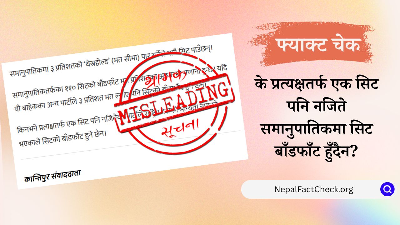 तर, नेपालफ्याक्टचेकले गरेको तथ्यजाँचमा उक्त दावी भ्रामक रहेको पुष्टि भएको छ। नेपालको निर्वाचन प्रणालीमा प्रत्यक्षतर्फ सिट नजिते पनि समानुपातिकतर्फ प्राप्त मतका आधारमा सिट प्राप्त गर्न सकिने व्यवस्था छ।