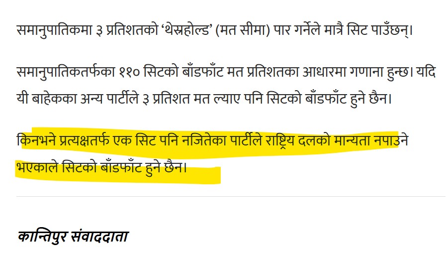 इकान्तिपुरमा प्रकाशित समाचारमा प्रत्यक्षतर्फ एक सिट पनि नजितेका पार्टीले राष्ट्रिय दलको मान्यता नपाउने भएकाले समानुपातिक सिटको बाँडफाँट नहुने दावी गरिएको छ।