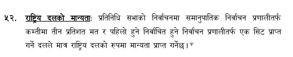 प्रत्यक्षतर्फ एक सिट र समानुपातिकमा कम्तिमा तीन प्रतिशत मत प्राप्त गर्ने दलले राष्ट्रिय दलको रुपमा मान्यता पाउने व्यवस्था राजनीतिक दलसम्बन्धी ऐन २०७३ को दफा ५२ ले गरेको छ।